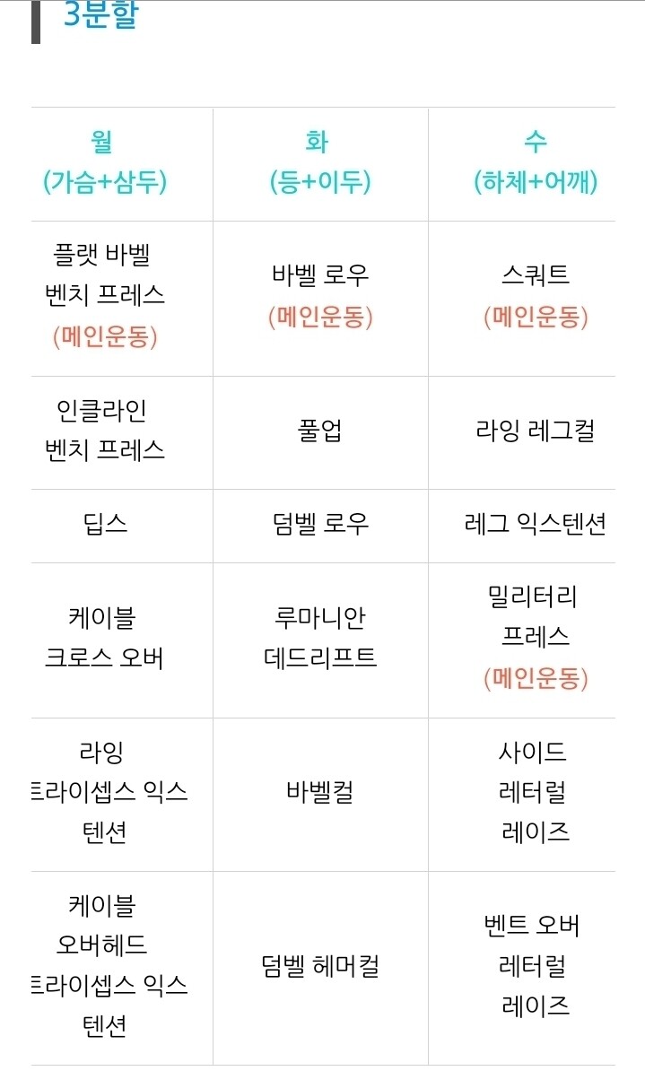 3파트 루틴 전신 근육 부위를 3개로 나누어 일주일에 3회 실시하는 것을 3파트 루틴이라고 합니다. 각 부위에 충분한 자극을 주고, 충분한 회복시간을 보장해주기 때문에 많은 분들이 하시는 운동루틴입니다. 일반 3부 루틴 구조 상체(가슴, 어깨, 삼두근) 하체(다리, 엉덩이), 등, 팔뚝