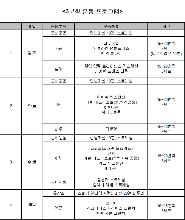 각 부위를 집중적으로 훈련한 후 48시간 이상의 회복시간이 주어지므로 운동 후 충분한 수면과 영양섭취로 근육을 회복시켜야 합니다.