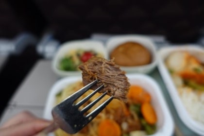 이륙 후 약 1시간 정도 지나면 첫 번째 기내식이 제공됩니다. 이번 메뉴는 비빔밥, 소고기, 닭고기 입니다. 델타에서 치킨을 맛있게 먹었던 기억이 나서 비교를 위해 이번에 치킨을 받았습니다. 그리고 역시 스테인레스 식기류는 100점 만점에 200점을 주고 싶습니다.