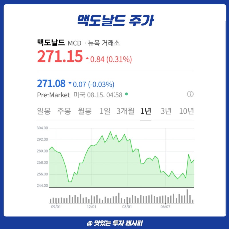 오늘은 최근 발표된 실적과 이슈 분석, 주가 전망 등 적자 배당왕 맥도날드에 대해 자세히 알아보는 시간을 가져봤습니다. 이상을 요약하면 맥도날드는 경기침체 속에서도 프랜차이즈 모델을 통해 안정적인 현금흐름과 높은 브랜드 인지도를 갖고 있다. 충성심은 맥도날드의 강력한 경쟁 우위이자 핵심 자산입니다. 앞으로도 아시아와 중동 지역 매장 확대와 프리미엄 메뉴 출시를 통해 판매 다각화를 꾀하는 한편, 모바일 앱과 키오스크 중심의 디지털 전략으로 고객 경험과 배송 서비스를 개선할 예정이다. 매출 성장에 지속적으로 기여할 것으로 예상되지만 위험도 있습니다. 인플레이션으로 인한 비용 상승과 일부 시장의 공급망 문제로 인해 McDonald의 이익 마진이 압박을 받을 수 있습니다. 또한, 최근 식중독 사건 등 위생 관련 문제도 단기적인 평판 리스크로 작용할 가능성이 매우 높습니다. 그럼에도 불구하고 맥도날드는 매력적인 배당주와 무시할 수 없는 안정적인 수익구조를 갖춘 회사이기 때문에 배당 안정성을 중시하는 투자자들의 포트폴리오 선택이다. 주식이 될 수도 있을 것 같습니다. 읽어주셔서 감사합니다. 좋은 하루 되세요. ※ 본 내용은 미국주식에 대한 개인적인 분석으로 투자권유나 주식추천을 위한 것이 아님을 알려드립니다.