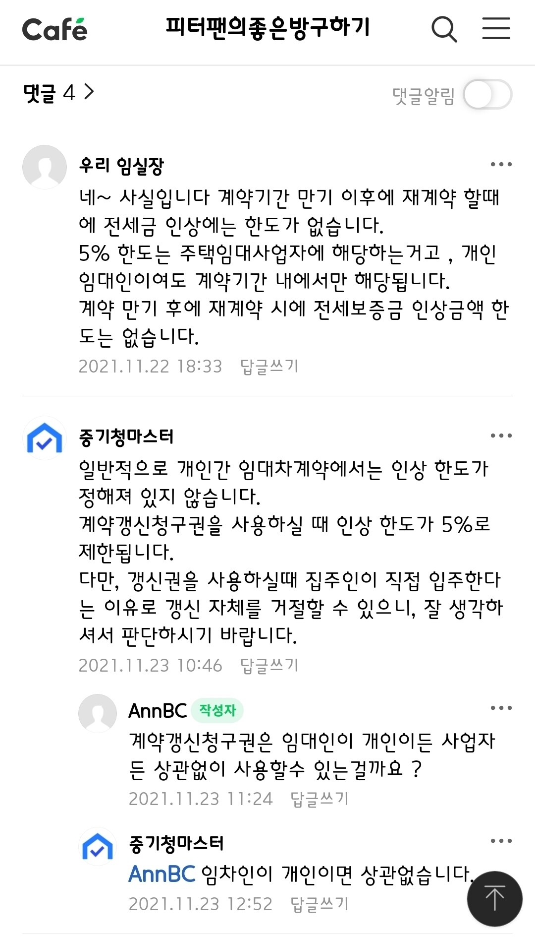 이처럼 대부분 임차인 보호를 목적으로 구성되어 있어 집주인 입장에서는 상대적으로 손실이 크다고 느낄 수 있을 것입니다. 그래서 보증금 인상 한도에 대해 부정적 시각을 갖고 계실 수도 있지만, 위에서 언급한 것처럼 새로운 임차인과 재계약을 할 때에는 기존 금액에 제한이 없기 때문에 본인이 원하는 금액을 정하시면 됩니다. 원하다. 또한, 용선기간을 연장함으로써 총 4년의 용선계약이 완료되고, 갱신 시기가 도래해도 한도가 다시 적용되지 않는다는 점에서 장점을 얻을 수 있다. 그리고 임대인이 계약 연장을 원하지 않는 경우 임대인 측은 특별한 경우를 노려 임대인 또는 임대인의 직계존비속이 거주한다는 사실을 통지한 후 임차인을 퇴거시킬 수도 있습니다. 따라서 임차인은 집주인에게 실제 거주이유에 대한 증빙을 요구할 수 있습니다. 다만, 계약을 갱신하지 않고 거주하다가 2년이 채 지나지 않은 시점에 다른 세입자와 계약을 하다가 적발된 경우에는 새 세입자에게서 받은 임대료를 이전 세입자에게 청구해야 합니다. 따라서 가능하면 법적으로 요구되는 부분을 준수하는 것이 중요합니다.