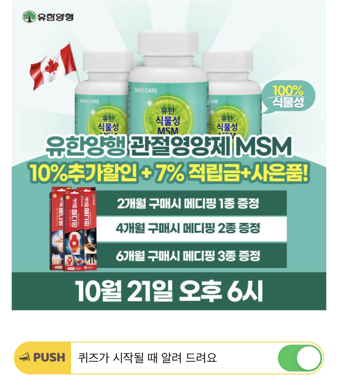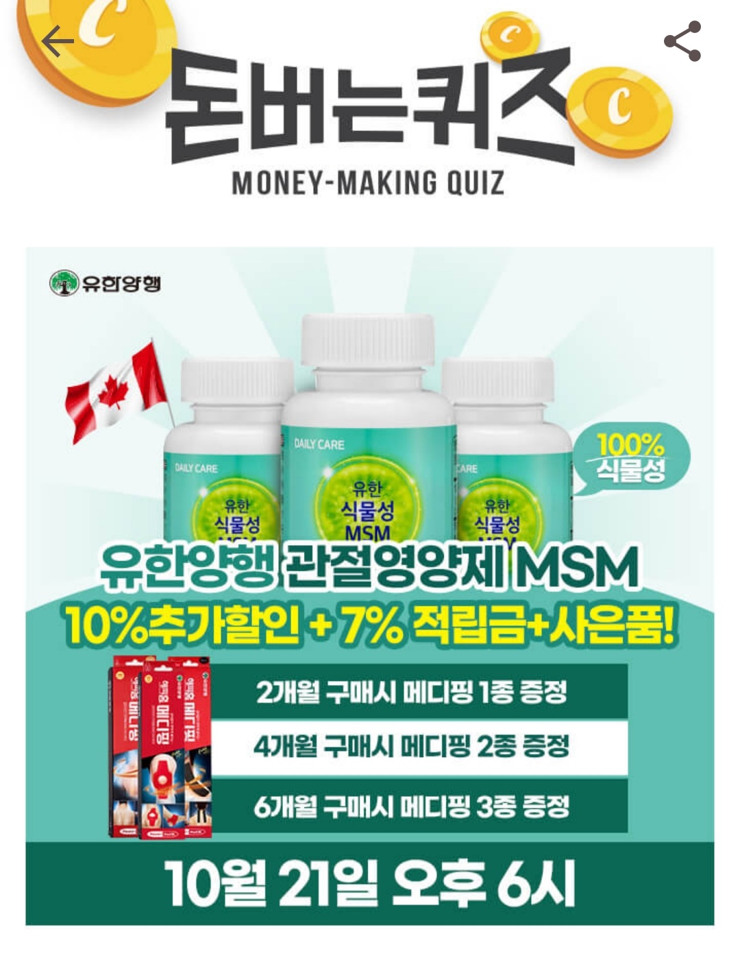 히루~ 캐시워크 돈 버는 퀴즈 정답 9월 10일 유한양행의 식물성 MSM 관절영양제 내용을 공유해 드리고자 합니다. 정보를 찾기 위해 많은 사람들이 검색을 하고 있습니다.