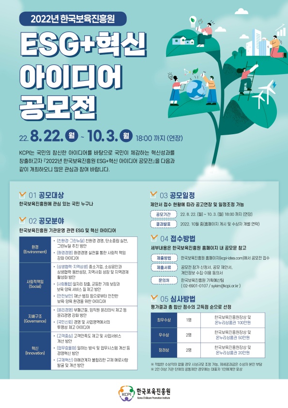 또는 제출 2. 담당자에게 이메일 제출([email protected]) 공모전 분야 현장 콘텐츠 서비스 혁신 선제적 행정 고객 권익 보호, 규제 개선 아이디어 고객 만족 디지털 활용 등 고객 편의 제고 기술 아이디어 신사업 미래 성장동력 확보 경영 프로세스 효율화를 위한 신사업 아이디어 업무 합리화, 업무 중복 해소 아이디어 일하는 방식 불필요한 업무 해소, 업무 부담 경감 아이디어 조직역량 및 조직문화 개선, 인력 및 조직운영 합리화 아이디어 확산 협력 대국민 소통 고객 및 국민 참여 및 인식 제고 아이디어 ESG 사업환경 및 안전관리 확대, 지역 상생 아이디어 협업 과제, 민관협력을 통한 문제해결 아이디어 수상내역 최우수: 1명(50만원) 우수: 2명 명 (각 30만원) 장려 : 3명 (각 10만원) ※ 시상 관련 제세공과금은 우승자 부담입니다. ※ 평균점수 60점 이상인 작품만 수상작으로 선정하며, 대상은 평균점수 80점 이상인 경우에만 시상합니다. 선정문의는 공무원연금서비스혁신기획실 : 064-802-2156