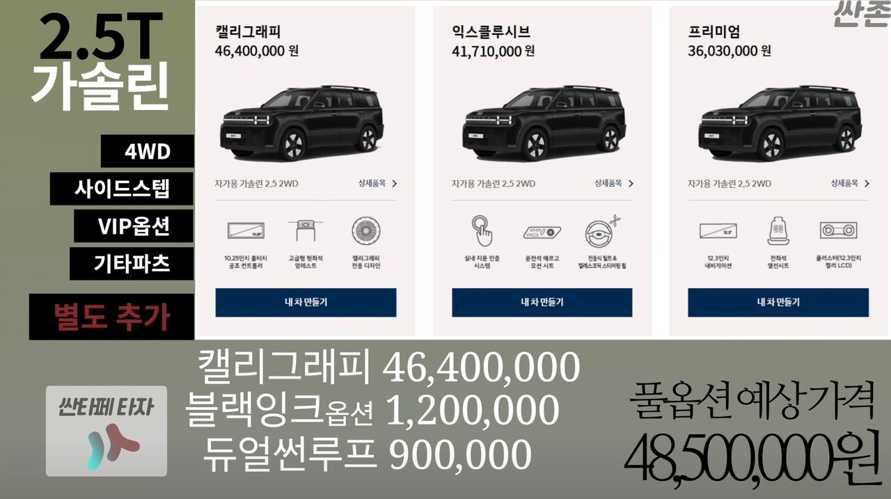 싼타페 풀체인지 옵션(외장 색상) 싼타페 풀체인지 모델에는 총 9가지 외장 색상이 있습니다. 색상별로 추가 비용이 발생하는 유료 옵션으로 분류됩니다. 여담으로, 외장 색상 선택 시 일부 내장 색상 옵션을 선택할 수 있습니다. 이는 선택사항이 아니니 주의하시기 바랍니다. (좌) 울시 브레스 메탈릭(매트) 선택 시 20만원 추가 (중) 크리미 화이트 선택 시 8만원 추가 (우) 크리미 화이트 매트 선택 시 20만원 추가 (좌) 페블 블루/사이버 세이지 (우) (좌) ) 오카도 그린/테라코타 오렌지(우)(좌) 마그네틱 그레이/어비스 블랙(우) 싼타페 풀체인지 옵션(인테리어 색상) 싼타페 풀체인지 인테리어 색상 구성 외장 색상과 달리 8가지 구성 중 선택 가능합니다. 게다가 인테리어 색상도요. 일부 외장 컬러 옵션은 선택 시 선택이 불가능할 수 있으니 참고하시기 바랍니다. (좌) 블랙 원톤 / 나파가죽 (우) 블랙 원톤 / 천연가죽 (좌) 블랙 원톤 / 인조가죽 (우) 피칸 브라운 / 천연가죽 (좌) 피칸 브라운 투톤 / 나파가죽 ( 우) 그레이 투톤 / 천연가죽 (좌) 라이트 베이지 투톤 (우) 블랙 잉크 (블랙 잉크만 해당) 싼타페 풀체인지 옵션 (트림별 옵션) H 순정 제외 / N 퍼포먼스 (하단 사진) 이번에는, 트림에서 제공하는 옵션에 대해 다루고자 합니다. 상세 사항은. 아래 링크를 참고해 주시고, 자세한 옵션은 아래와 같습니다. 나만의 자동차 만들기(견적) > 01. 모델 선택 | 현대자동차 – Hyundai.com | 대한민국 대표 자동차 기업 hyundai.com 전기차, 승용차, SUV, 상용차, 택시 등 구매하고 싶은 차량의 견적을 편리하게 확인하세요. www.현대.com 2.5 익스클루시브 트림 *8방향 기준 전동식 조수석 : 20만원 *빌트인캠2 : 40만원 *듀얼 선루프 + 루프랙 : 99만원 *하이테크 플러스 : 124만원 *플래티넘 1 : 45만원 2.5 프레스티지 트림 기준 *듀얼 선루프 : 89만원*HUD : 59만원 * 빌트인캠 2 : 45 10,000 * 시트 플러스 : 740,000 * 플래티넘 2 : 990,000 * 파킹 어시스트 플러스 1 : 119만 * 현대 스마트 센스 : 790,000 2.5 캘리그래피 트림 표준(좌) : 듀얼 와이드 선루프 : 890,000(가운데) : 내장 -인 캠 2 : 450,000(우) BOSE 프리미엄 사운드 : 640,000(좌) 파킹 어시스트 플러스 2 : 790,000*현대 스마트센스 : 790,000 싼타페 풀체인지 모의 견적 이번에는 싼타페 풀체인지 모의 견적도 제시해 드렸습니다. . 이전에는 모든 옵션을 비교하는 대신, 이번에는 개인적으로 합리적이라고 생각되는 옵션을 추가한 구성으로 모의견적을 해보았습니다. (위탁수수료는 서울시 기준) (모든 모의견적은 2WD 기준) The All New Santa Fe 2.5 Ex. 포함(좌) 옵션 미선택 모의견적가 / 풀옵션 선택 모의견적가(우) 올뉴싼타페 2.5 프레스티지(좌) 일부옵션 선택 모의견적가 / 옵션 전부선택 모의견적가(우) 올뉴산타 Fe 2.5 캘리그래피(좌) 옵션선택 모의견적가/옵션 전체선택 모의견적가(우) 더 뉴 싼타페 1.6 하이브리드 익스클루시브(좌) 옵션 미선택 모의견적가/옵션 전체선택 모의견적가(우) ) 올 뉴 싼타페 1.6 하이브리드 캘리그래피(좌) 옵션 일부 선택 모의 견적 가격/옵션 전체 선택 모의 견적 가격(우) 모든 모의 견적 내용은 가격대 이해를 돕기 위한 것이며, 최종 가격은 참고하시기 바랍니다. 차량은 세금 등의 요인으로 인해 달라질 수 있습니다. 당신은 또한 이것을 알고 있어야합니다. 싼타페 풀체인지 가격/옵션표 싼타페 풀체인지 모델에 대한 옵션과 가격, 모의견적을 살펴보았습니다. 풀체인지 모델치고는 가격 인상폭이 그렇게 높지 않아서 선택률이 의외로 높을 거라 생각했어요. 싼타페 풀체인지. 전시장에서의 전시가 이달 말부터 진행될 것이라는 얘기가 많이 나오고 있습니다. 전시가 시작되면 포스팅하겠습니다 🙂 읽어주셔서 감사합니다. 싼타페 풀체인지 MX5 실제 테스트카 포착, 오프로드 느낌 좋다..!! (8월 10일 월드 프리미어) *본 포스팅에 사용된 사진은 네이버 남차카페 회원 ‘스바루790’님의 허락을 받아 촬영되었습니다… m.blog.naver.com