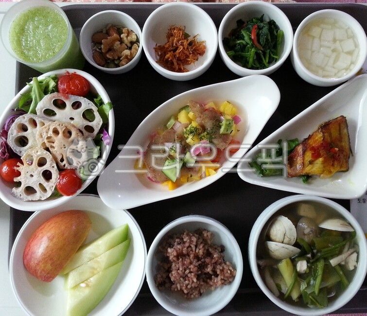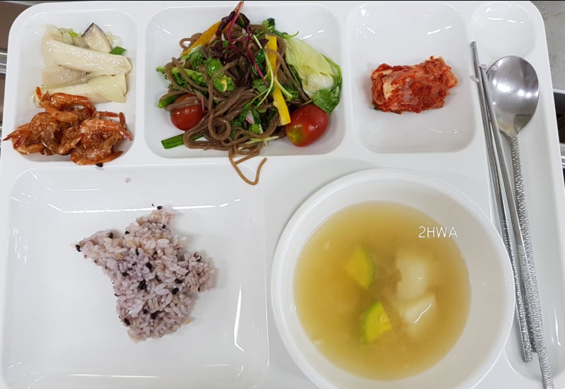 괜찮으세요? 저는 광주자양한방병원 영양사로 요리를 잘합니다. 오늘은 날씨가 너무 더워서 주방에 있는 에어컨과 선풍기를 풀 가동시켰습니다. 여름은 끔찍한 영양 실입니다. 여름 온천날을 위한 보라색 향 도시락을 소개합니다.해물, 게, 된장국, 춘천돈까스, 우동, 푸른채소, 벚꽃, 요거트, 배추김치